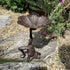 Talk about a balancing act! This cast iron acrobat frog sculpture strikes a whimsical, gravity-defying pose with a leaf bird feeder delicately perched on his foot. Crafted from durable cast iron with a rustic finish, it's the perfect accent for adding a touch of playful charm to your backyard, garden, patio or indoor decor. Position this acrobatic amphibian to greet guests on your porch or let him steal the spotlight in your living room. His frozen yoga-like stance creates an eye-catching focal point that doubles as a fun birdseed holder. Wherever you place this cast iron acrobat frog balancing a bird feeder leaf on his foot, it's sure to spark smiles and conversations.