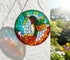 Crafted from richly coloured textured glass set within a strong circular frame, the artwork captures the elegance and energy of a hummingbird mid-flight. The metal hanging chain provides secure and easy display, allowing you to position it where sunlight can shine through and bring the colours to life. Whether displayed indoors or in a sheltered outdoor spot, it adds a sense of warmth, creativity, and nature-inspired charm.